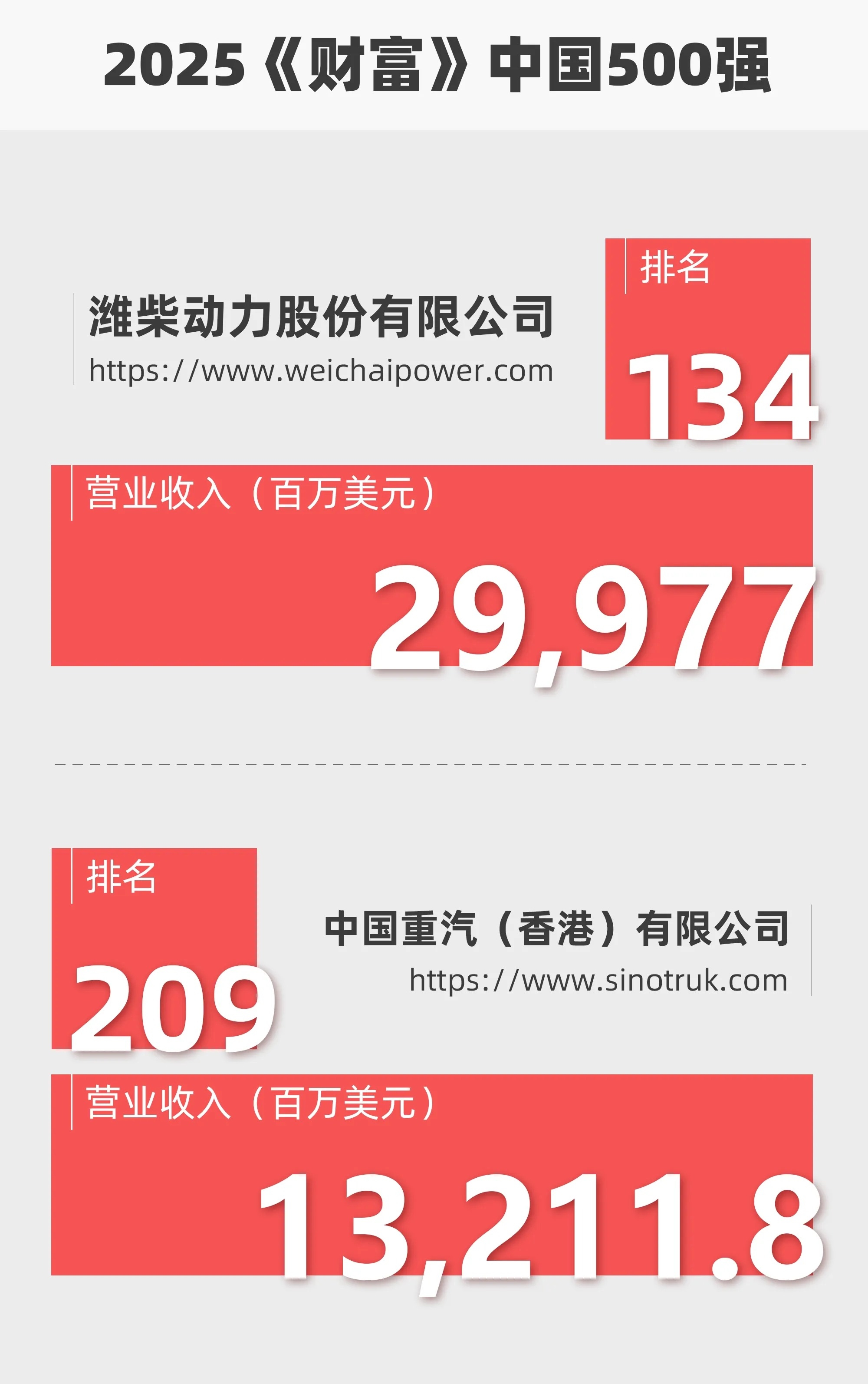 The 2025 Fortune China 500 list was recently released by Fortune China. Shandong Heavy Industry Group proudly announced that two of its subsidiaries, Weichai Power and China National Heavy Duty Truck Group (Sinotruk), have once again made the list with improved rankings. Weichai Power secured the 134th position, up 4 spots from last year, while Sinotruk (Hong Kong) rose by an impressive 21 places to rank 209th.